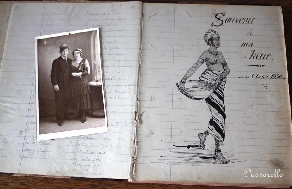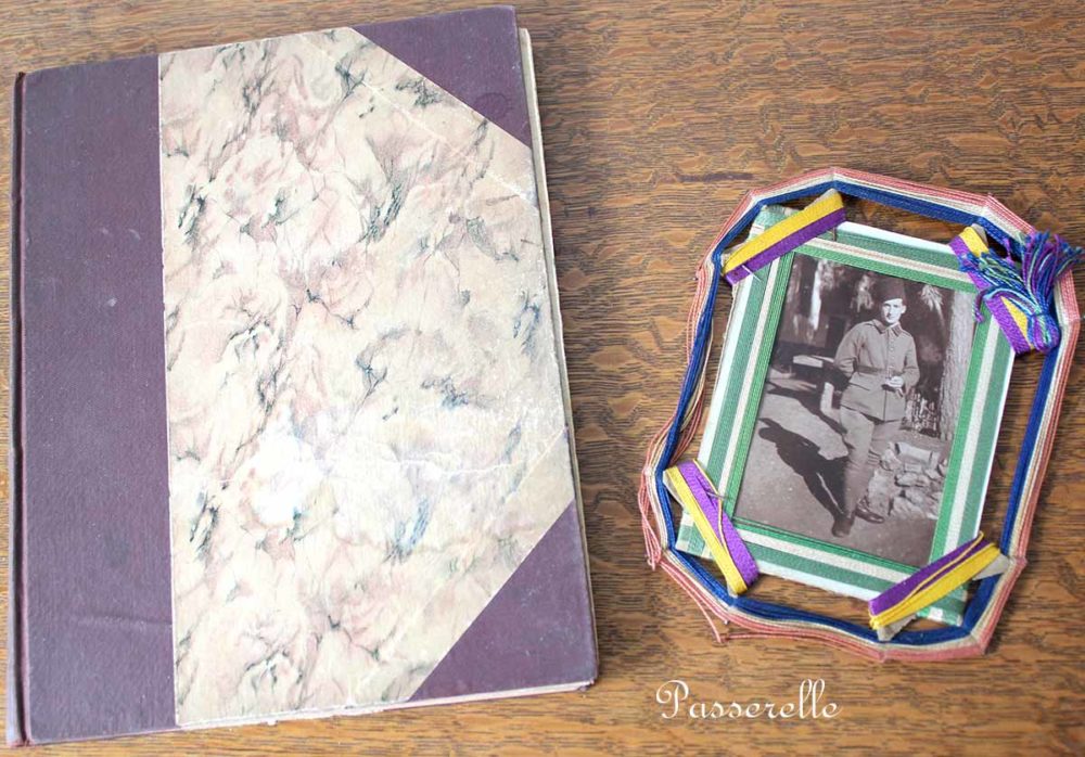 Ce cahier est un témoignage léger dans l’air du temps de toute une époque… je remarque sutout le cadre photo en fil 😉