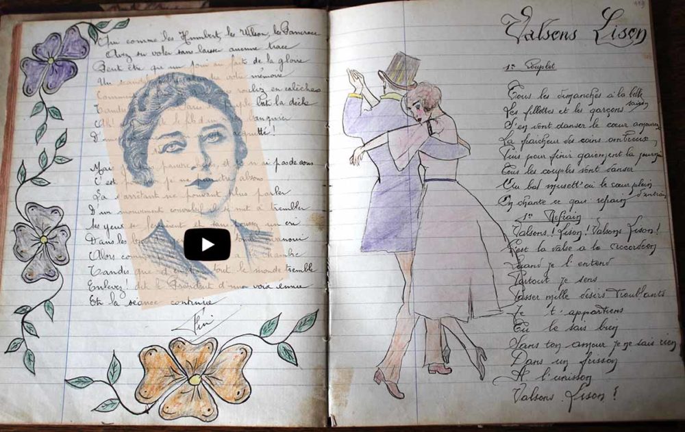 Quel chance et trésor d’avoir ce joli carnet de chansons! Je ne peux m’empêcher de sourire à l’écoute de la prononciation des mots des chansons de cette époque…..ils roulaient tous les rrrrrr et finissaient tous par euuuu….hé hé hé…..pèrrrrrreuuu…..mèrrrrrreuuuu…..trop chou ce style…..ça me rappelle une chanson de Léo Marjane que m’avait fait découvrir un ami – La Chapelle au Clair de Lune de 1937……la chapelle abandonnée-euuuu….