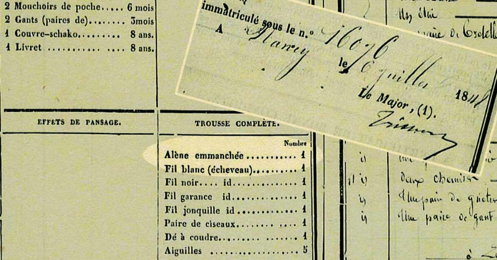 Évidemment, on peut gager que l’outil ne venait pas d’apparaître soudainement en 1884 ; probablement existait-il déjà au moment de la guerre de 1870, voire même avant mais pour ma part, je n’en ai pas de traces formelles. Dans ce livret militaire perdu au milieu de l’état civil reconstitué de la ville de Paris et qui concerne un soldat du 42ème régiment de ligne enrôlé en 1848, on trouve bien une alène emmanchée parmi la liste des effets. S’agit-il déjà d’une ancêtre de notre cousette ?