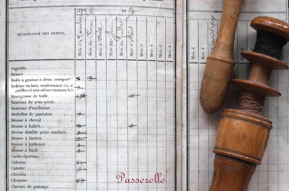Mon arrière-grand-père Georges Harrisson, né en 1869, fut donc appelé avec la classe 1889. Son livret militaire témoigne qu’on lui remit un képi, un pantalon, une veste, une paire de souliers des guêtres et une cravate mais aussi, en novembre 1890, une bobine en bois renfermant six aiguilles et une alène emmanchée. Ce n’est pas celle-là qui est posée sur son livret pour la photo, car malheureusement je n’ai sauvé aucun objet de ce côté-là. J’ai choisi pour l’illustrer une des cousettes de ma collection qui me semble être parmi les plus anciennes.