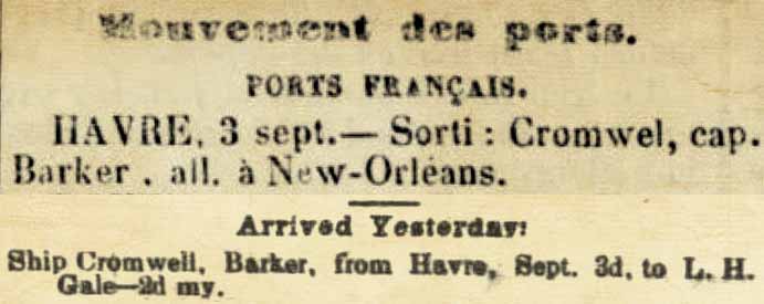 Le manifeste donne une première indication sur le fait que le Cromwell doit être un navire marchand et non pas un paquebot, par le nombre de passagers et surtout par leur répartition entre l’entrepont et les cabines. J’en trouve la confirmation par la presse avec le détail du fret qu’il a pris en charge pour Le Havre, coton et tabac, ainsi que l’annonce du capitaine Barker pour trouver des passagers d’entrepont.