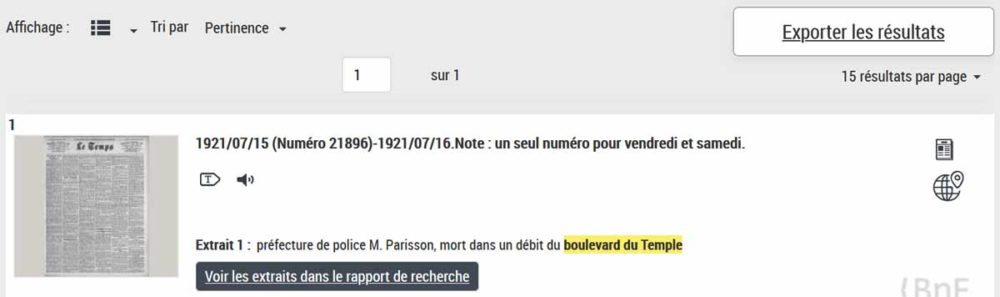 Les résultats qui sont renvoyés sont très exploitables puisqu’ils sont limités à neuf publications. Ils sont un peu parasités par quelques salles de spectacle situées boulevard du Temple, comme le cinéma le Majestic ou le théâtre Dejazet, mais il est facile de les éliminer à première lecture.