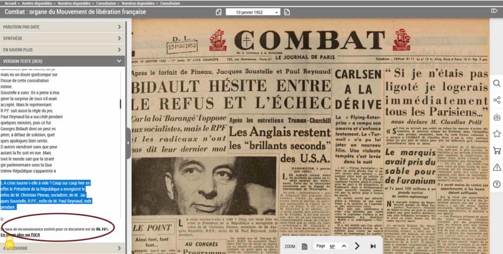 Gallica annonce le taux de reconnaissance théorique pour le document dans lequel vous vous trouvez : cette information figure en bas dans le volet de gauche quand vous dépliez la rubrique Version texte (OCR). Pensez aussi, si vous avez besoin de récupérer une assez grande portion de texte, que vous pouvez le faire en le sélectionnant également dans ce volet. Vous n’avez plus ensuite qu’à le coller dans votre article de blog, par exemple, en ayant seulement à corriger les éventuelles erreurs à l’océrisation.