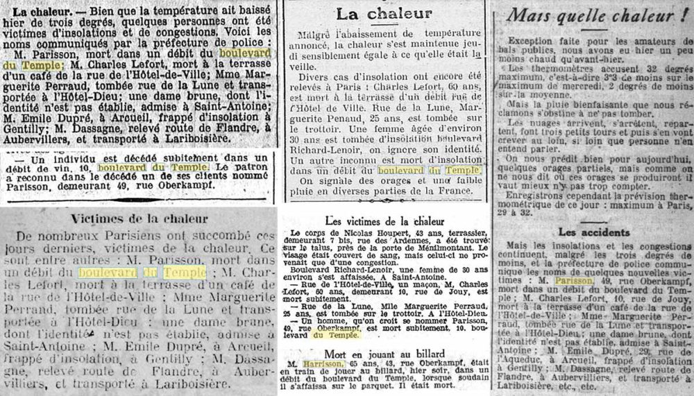 Bref, grâce à cette recherche abordée un peu en crabe, mais qui doit cependant tout à la reconnaissance de caractères, j’ai pu glaner à droite à gauche des détails qui m’ont permis d’éclairer les circonstances de cette mort a priori mystérieuse. Mon cousin Philippe s’est pris un coup de chaud en jouant au billard, dans un débit de boisson du boulevard du Temple. Il n’était pas le seul puisque d’autres accidents malheureux sont survenus le même jour, qu’on impute à une canicule exceptionnelle.