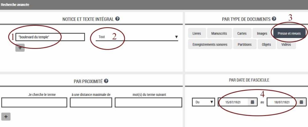 Ensuite je restreins la recherche à la presse (3). L’intérêt de choisir Presse et revues dans le type de document est que la zone des dates (4) va immédiatement s’ajuster pour me permettre de faire une recherche très fine au jour près. Dans mon cas, je cible le lendemain de la mort et je me limite à trois jours, ce qui me semble raisonnable pour ce qui doit n’être qu’un simple fait divers.