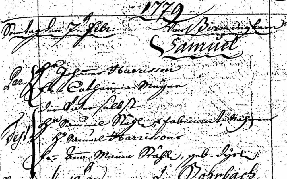 Je reste aujourd’hui encore avec plus d’interrogations que de réponses. Par exemple qui serait ce Samuel Harrisson qui me parait listé dans les témoins ? Comment remonter plus avant du côté de Catherine Meyer, dont je fais l’hypothèse qu’elle est Suisse et rencontrée sur place par mon ancêtre venu d’Angleterre ? Comment appréhender les relations entre les familles protagonistes de mes actes ? Où se cache l’acte de mariage de Catherine Meyer et de Jean Harrisson ?