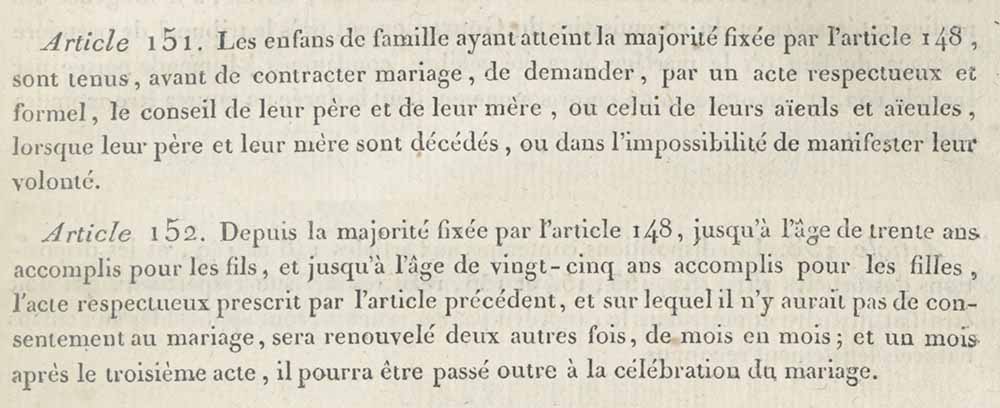 Car Alphonse et Elmire ont largement atteint la majorité matrimoniale qui est, à l’époque, de vingt-et-un ans pour les filles et de vingt-cinq ans pour les garçons ; ils peuvent donc se marier sans le consentement de leurs parents. Mais la petite subtilité introduite par le code civil de ce bon vieux Napoléon, qui par ailleurs a tant fait pour brider l’autonomie des femmes, c’est qu’ils devront tout de même, leur vie durant, solliciter « le conseil de leur père et de leur mère ». Le plus souvent, les parents sont présents le jour du mariage, manifestant ainsi leur approbation.