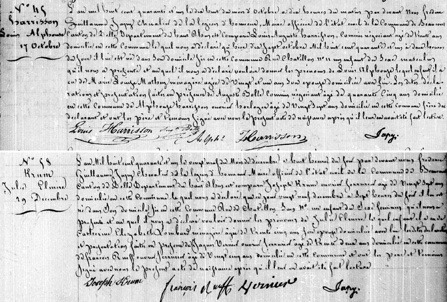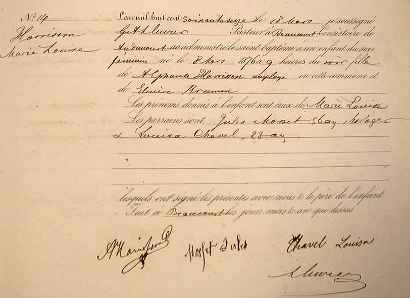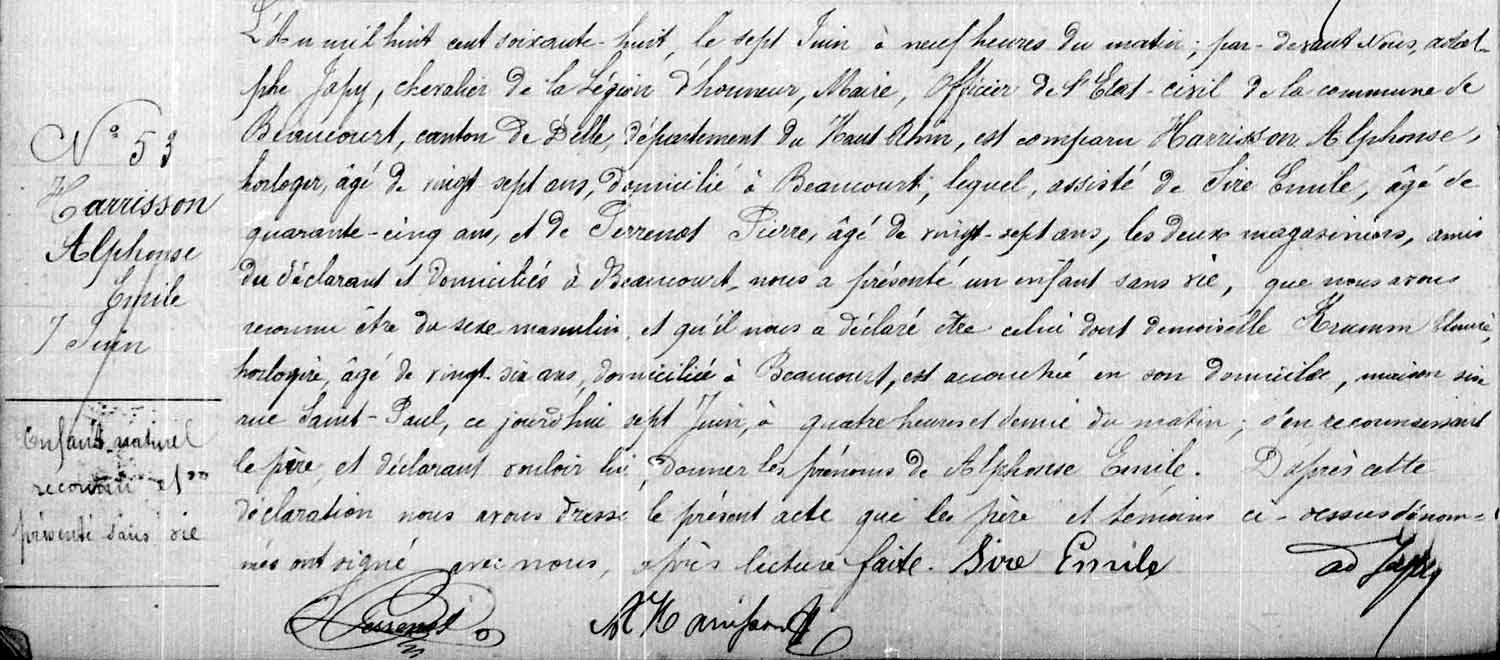 Il sera donc Alphonse Émile, premier enfant d’Elmire Krumm et d’Alphonse Harrisson, horlogère et horloger de leur état, si peu né à Beaucourt ce 7 juin 1868.