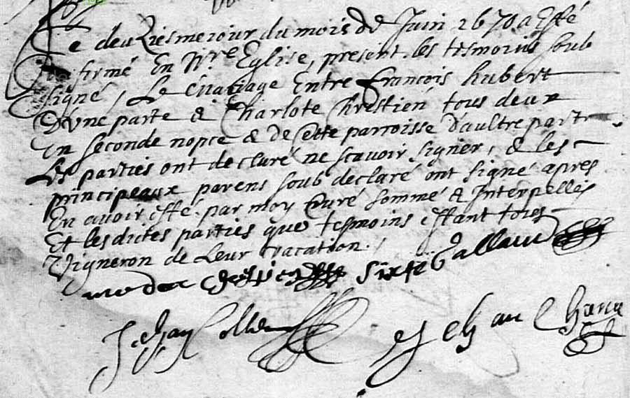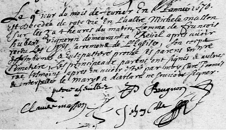 Jeanne quitte la vie huit ans après lui. Mais d’elle, qui se souvient ? Le troisième febvrier 1723 a été inhumée au cimetière de céans le corps de Jeanne Hubert épouse en troisièmes nopces de Barthélémy Le Riche, âgée de soixante ans ou environ, après avoir reçu les sacremens de l’église où nous l’avons conduite avec les cérémonies ordinaires en présence des parens et amis soussignez.
