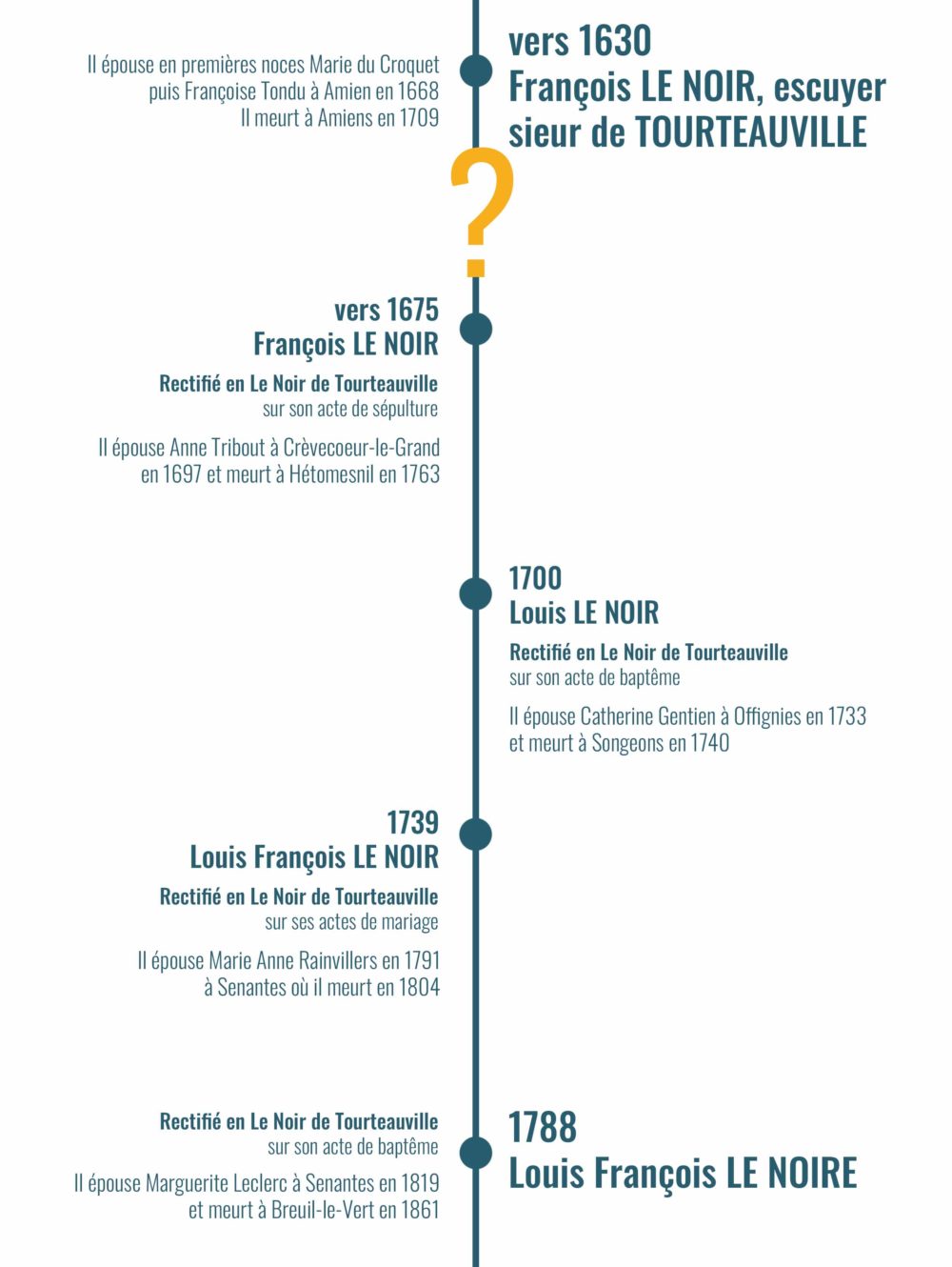 Toujours est-il qu’il obtient en 1900 le jugement qu’il espérait et qui, à partir de lui, remonte sur cinq générations en rectifiant toute la chaîne de l’état civil, après être parvenu à accrocher notre branche patronymique à un Le Noir, écuyer et sieur de Tourteauville au XVIIe siècle.