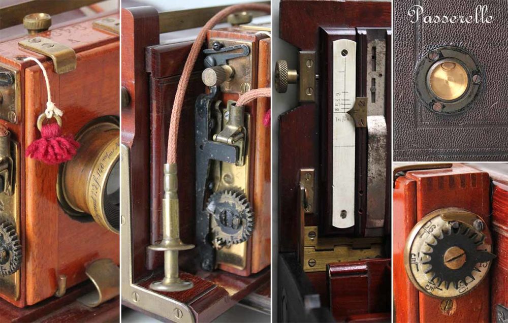 J’admire aussi le mécanisme qui permet de déplier un soufflet de cuir rouge à sept plis pour avancer le bloc de l’objectif. Le cuir a gardé toute sa souplesse, le bois me semble être de l’acajou et le métal majoritairement du laiton.